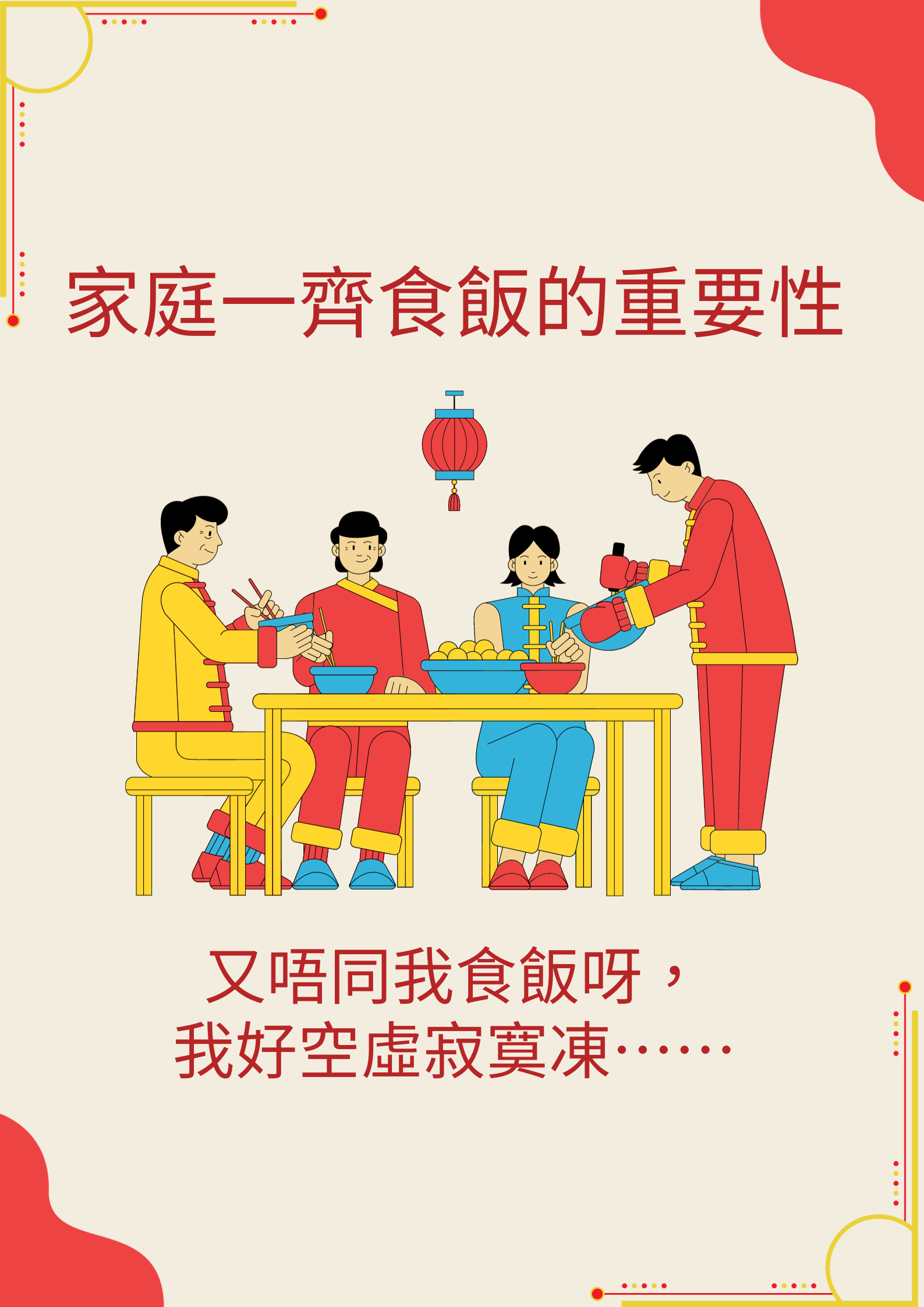 有小朋友向我抱怨,父母總是不與自己共進晚餐,每晚都因各種公事為由,持續好幾個月都是小朋友獨自一個食晚飯,開始時小朋友表現興奮和快樂,一副我解脫了的狀況,滿心歡喜地選擇自己喜歡的食物,一面玩平板電話,一