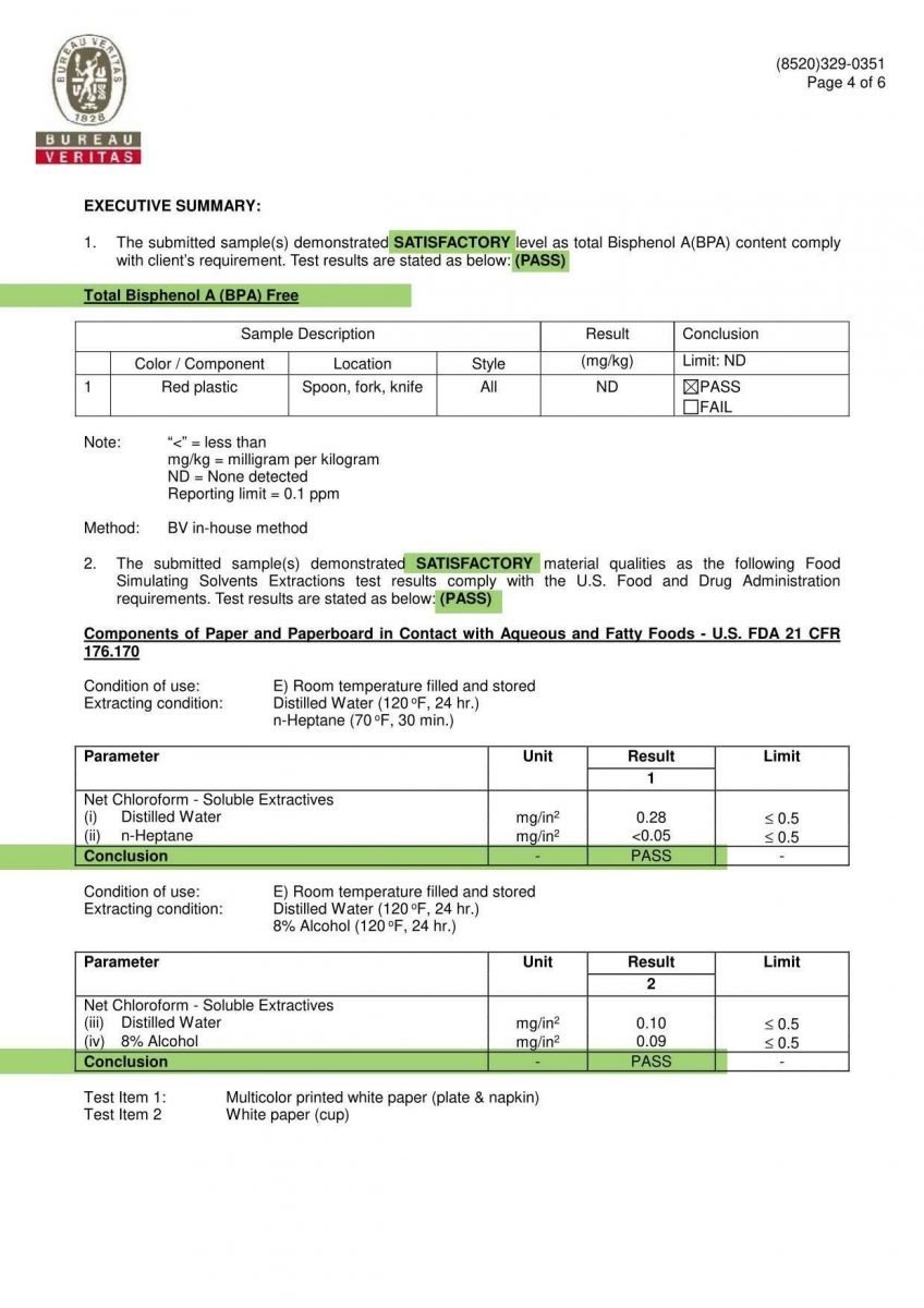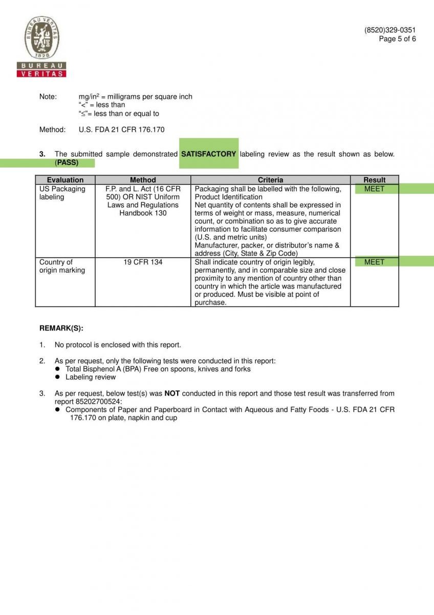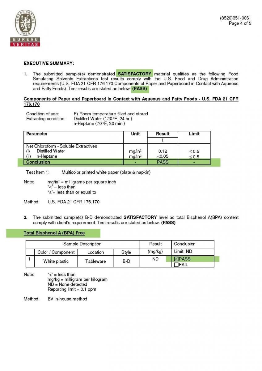 USA FDA Food Safety Test report (US FDA 21CFR 176.170)