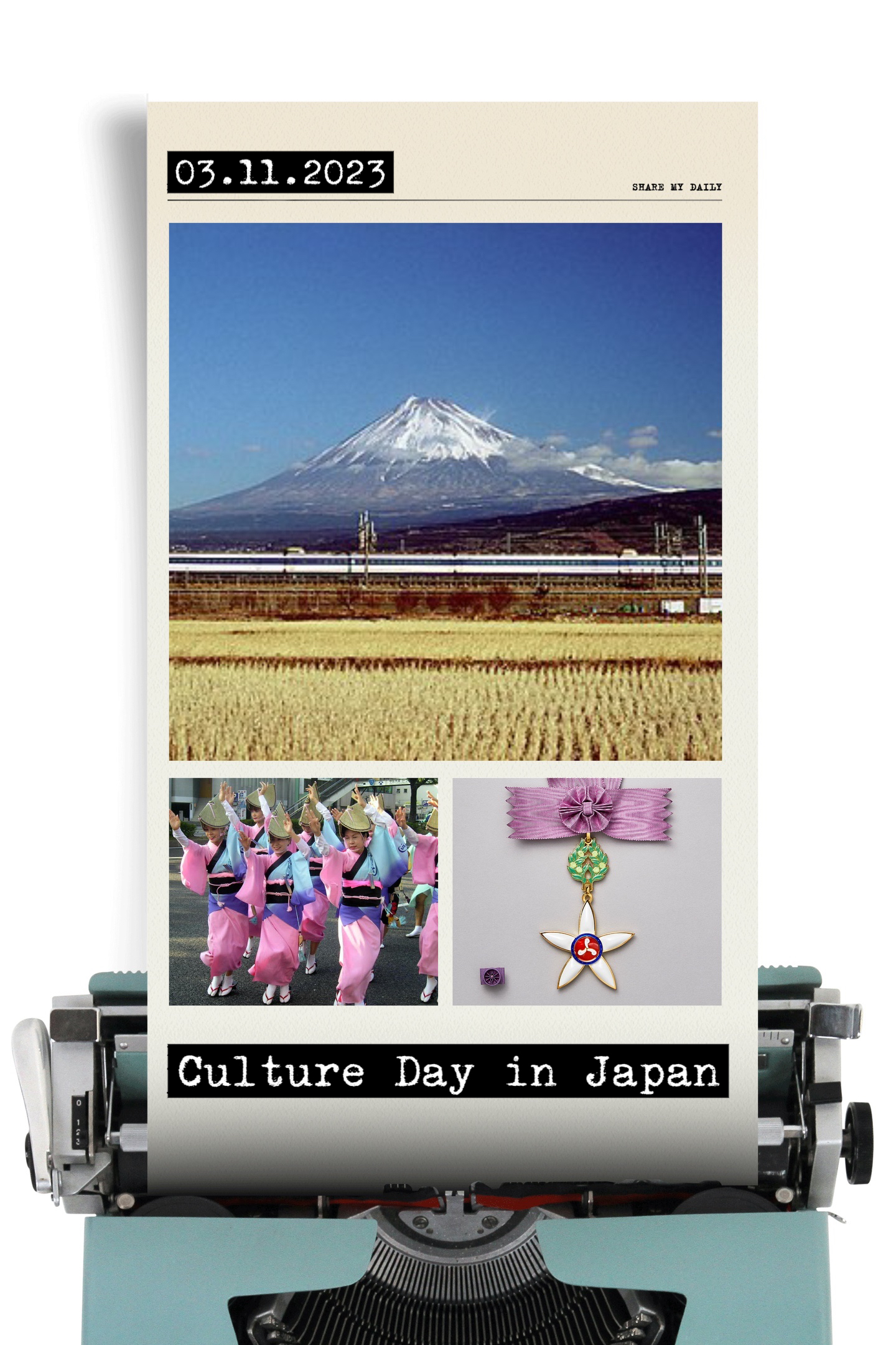 The Culture Day has evolved from the Meiji Festival, the birthday of Emperor Meiji on 3 November, which was then known as the “Tenchō-setsu“. After the end of World War II, Japan announced a new constitution on 3 November 1946, which advocated peace and culture, and the Japanese government designated 3 November as the “Culture Day”.